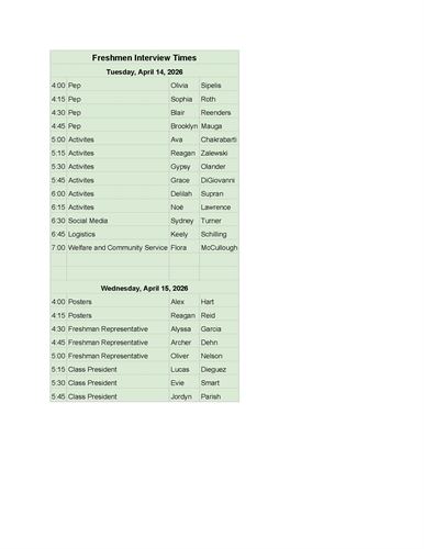 Below is the interview schedule for incoming freshmen for the 2026-27 school year. We have assembled a panel to interview you and assess your skills as they relate to leadership and how that can help the students of San Clemente High School. Because we have had to put together a panel for this, we do not have much wiggle room on the times and no flexibility on the dates. Your interview will take place in Triton Center, which is the big building at the corner of Pico and Presidio. Please be on time and ready to go at your assigned time slot. If you have anything to show us that requires technology, please send to me in advance if possible. I have included our current ASB President, Allie Borgerding, and our current ASB Vice-President and ASB President Elect, Brooks Lawrence, on this email in case you have questions for them. And finally, the interview times are 15 minutes each which means you have 15 minutes to show us how awesome you are. I am confident that you all will do great. See you in a few weeks.